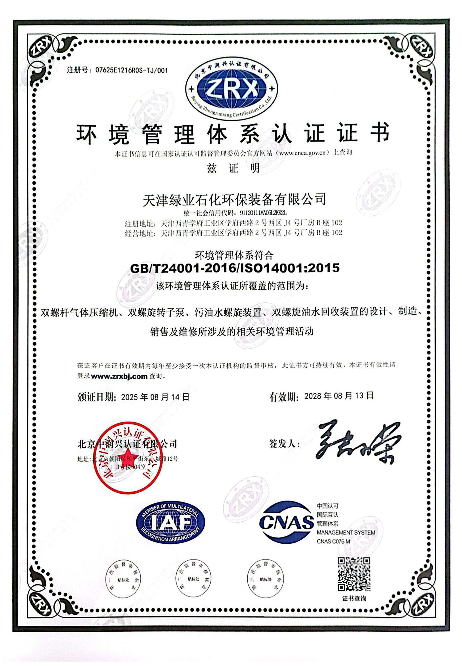 ISO14001 System Certification Certificate