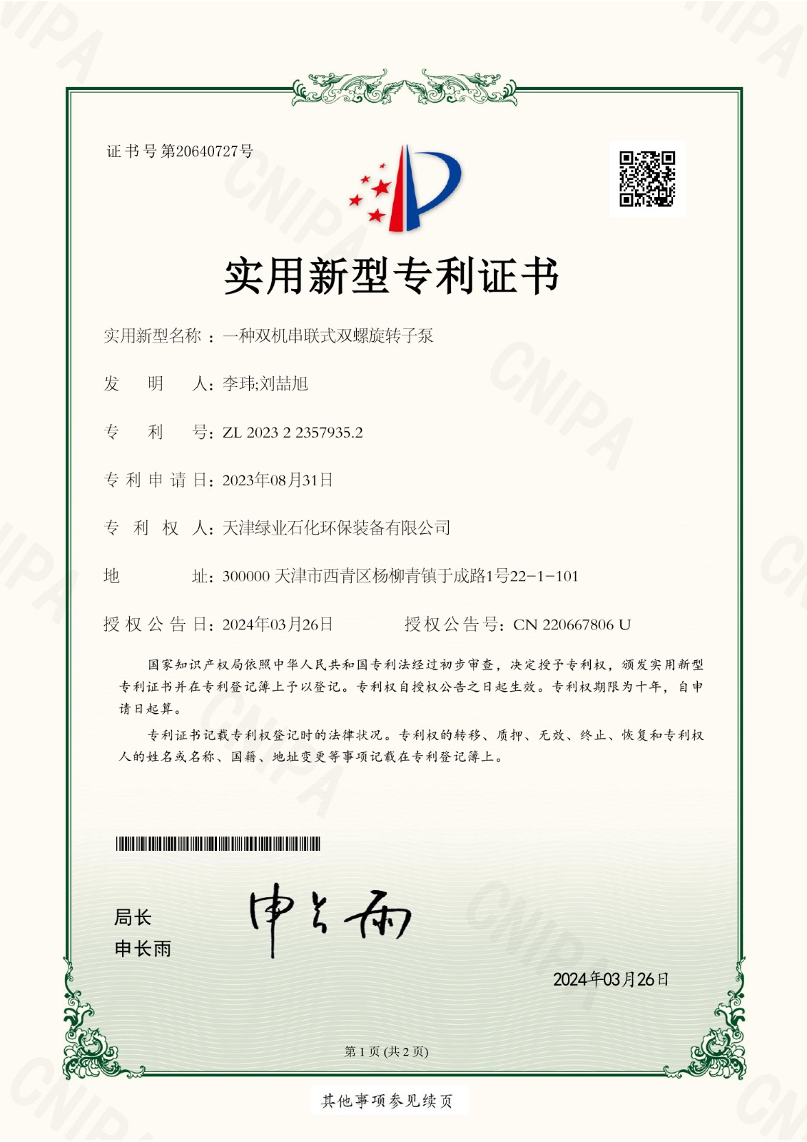 Patent: A dual-machine series double-screw rotor pump