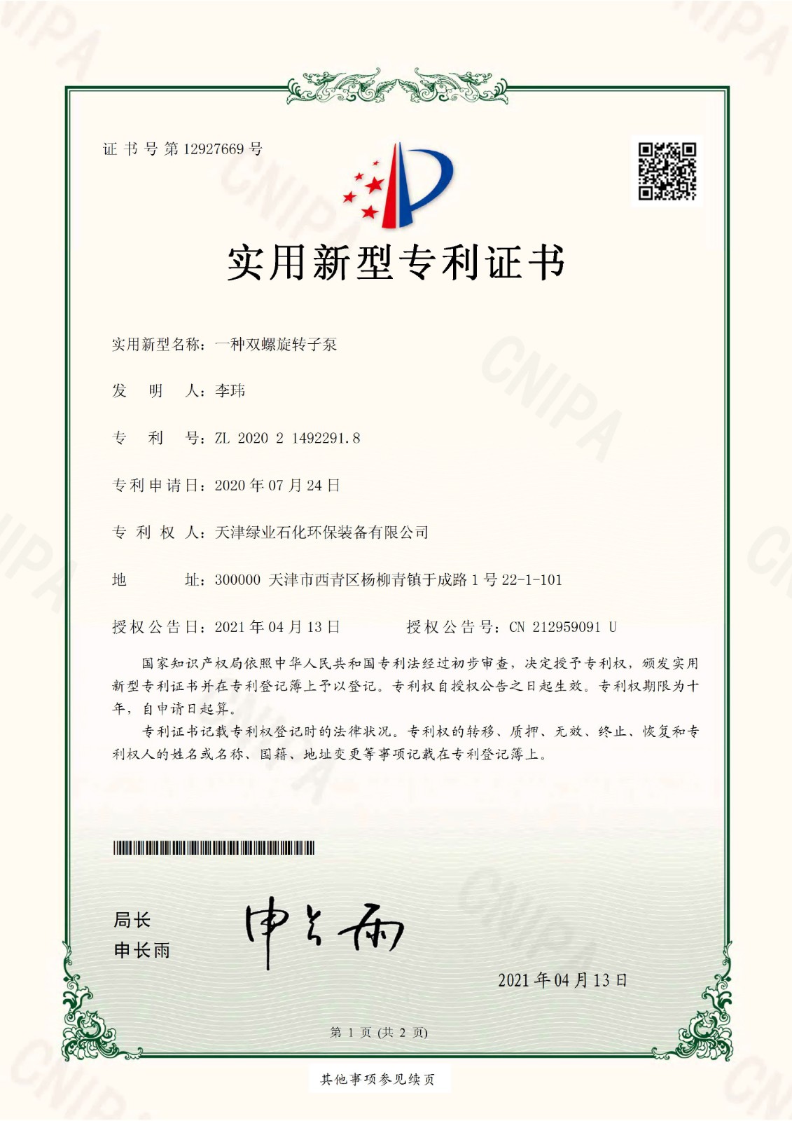Patent: A Patent for a Double Helix Rotor Pump (2)